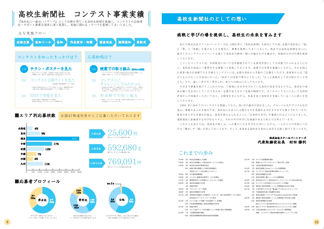高校生が参加する各種コンテストをトータルにお手伝い。「広報(宣伝・告知)」から、「作品受付」「表彰式運営」まで、お受けすることが可能です。 なかでも弊社が最も得意としているのが、貴学および高校生の情勢に合わせた「テーマ選び」です。 「学部学科と連動させたい」「応募数を増やしたい」「従来とは違う層にアプローチしたい」といった、大学様によって異なるご要望にお応えするテーマを、貴学とともに考案いたします。
